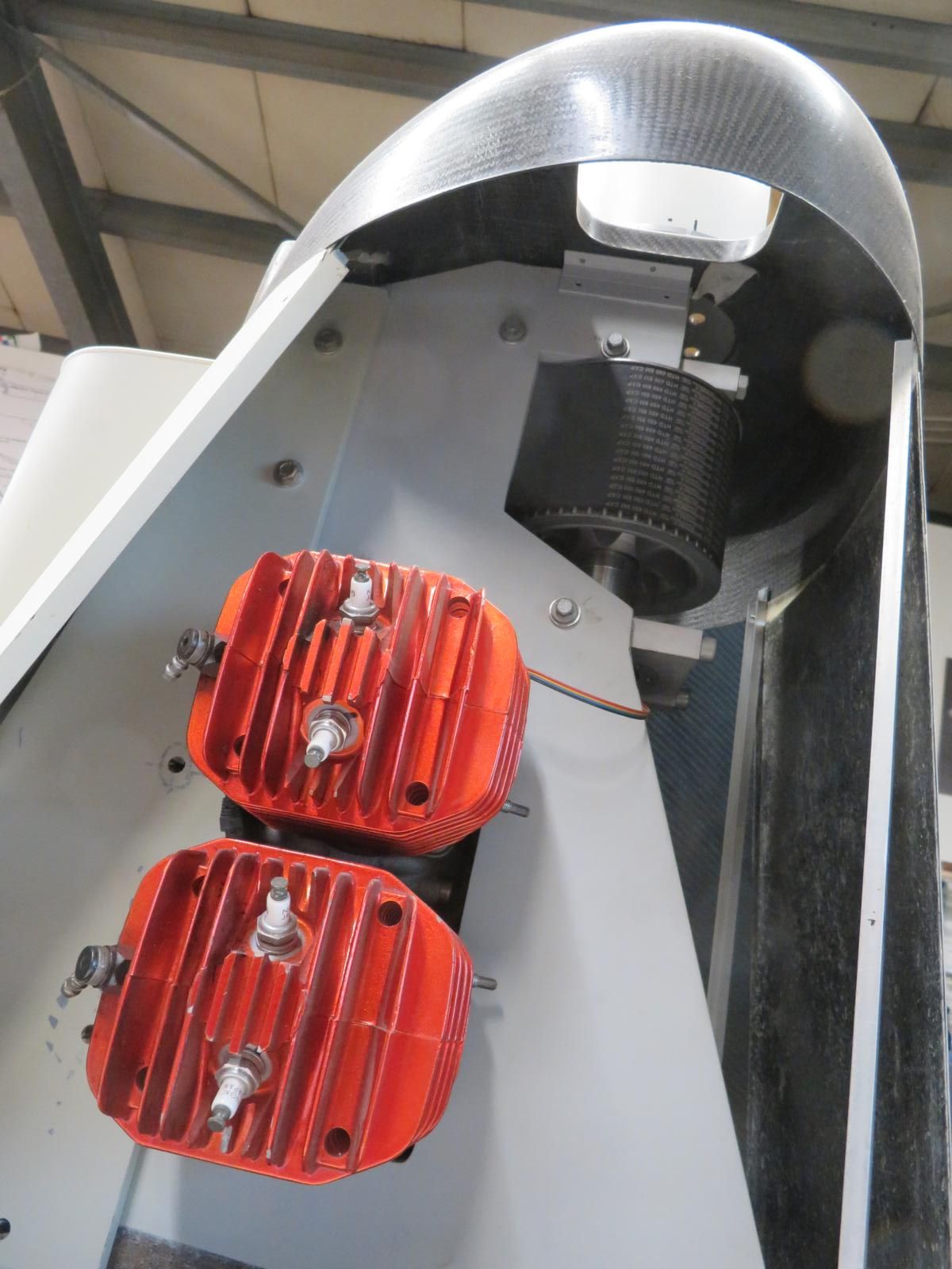 Dieser 3W- Motor entwickelt dann mit einem 1:2,1 Eigenbaugetriebe und dem Seidel-Propeller 55 x 39 einen Standschub von 180kg. Getriebe 1:2,1 weil: ansonsten kommt es zu einer punktierten Belastung der Zahnriemen und so verteilt sich die Belastung dann besser.